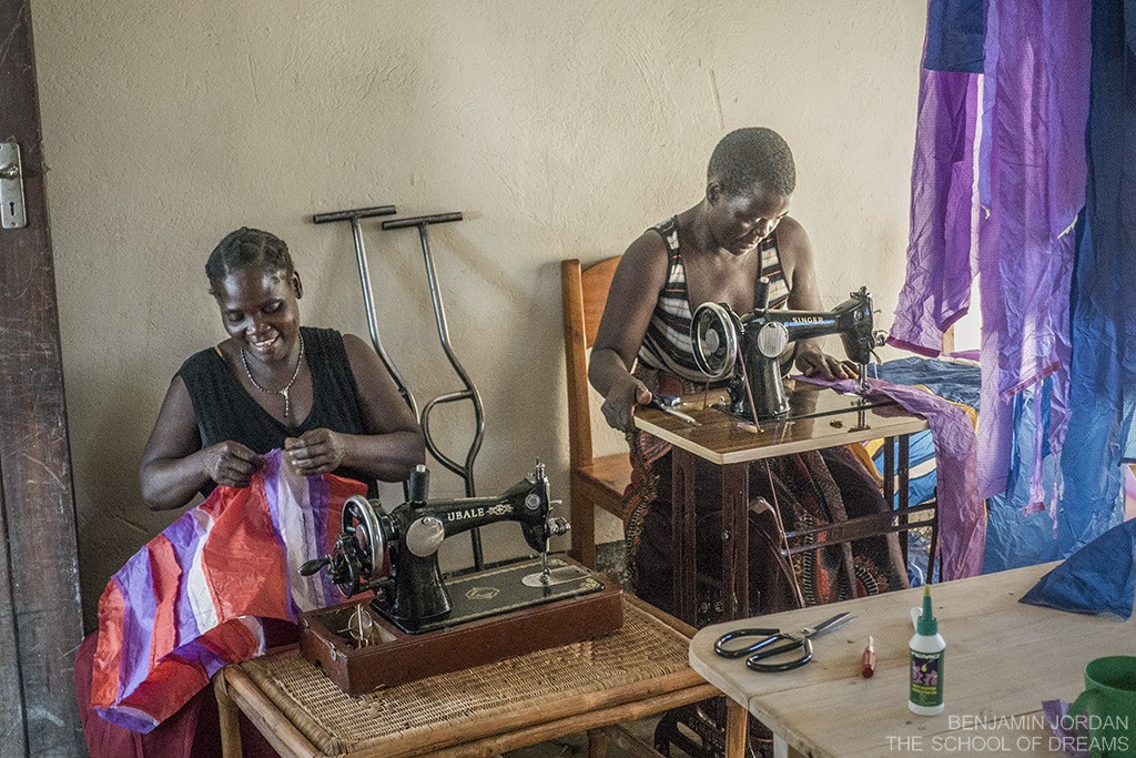 Yvodia and Amai Jo work as a team. Amai is just getting used to sewing so she assembles the strips into large mosaic textiles. Yvodia, who has been sewing for a few years, though much simpler designs, has learnt to carefully stitch those mosaics into completed bags.
