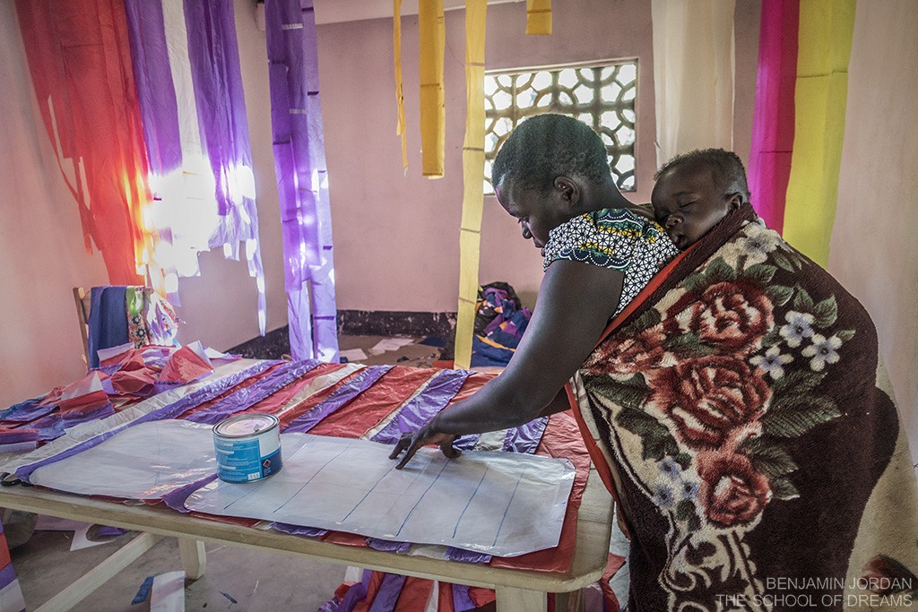 A Malawian woman works with extra care as her newborn reminds her of why these new skills are so important to her. She is tracing Adventure Bag patterns out of recycled paragliders that she spent yesterday stitching together. With her earnings she can buy the things she needs without having to sell her family's food. These beautiful bags will become available beginning next week.