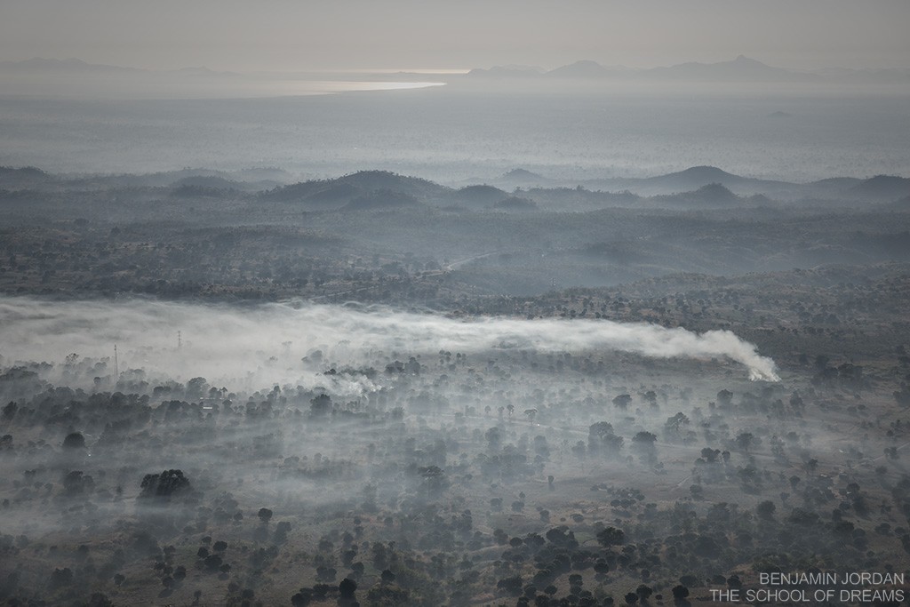 Smoke from a burial stretches across the landscape before the morning inversion breaks.