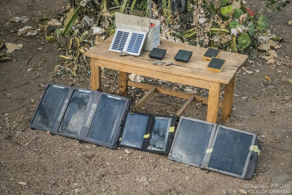 The battery pack I shared last week gets charged every day by this little family of panels. Despite their different sizes and age, all these Nomad panels are compatible with one another and combine their power to speed up the charging process. Goal Zero has donated them for the School of Dreams community centre.