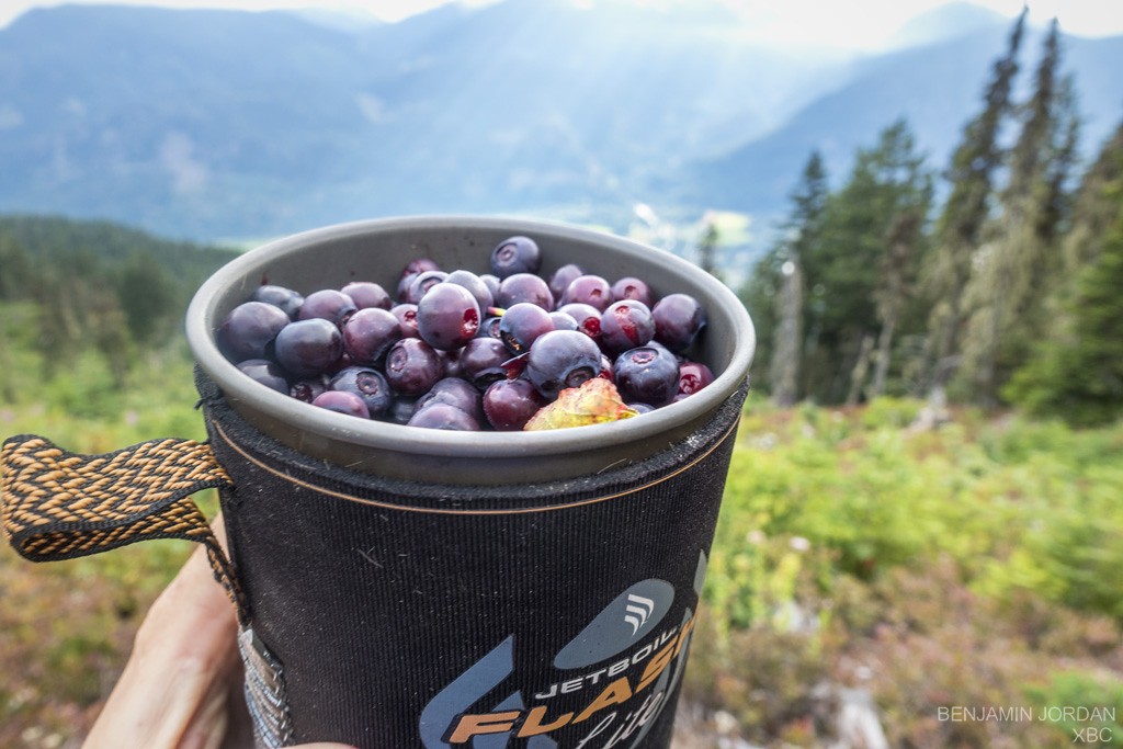 I was once that guy who walked by wild mushrooms, greens and fruit, so excited about the dehydrated items in his pack that he was completely oblivious to the abundance at his feet. But this trip changed all that. Having to carry my own food and with no set route meant having to constantly count the number of calories remaining, versus my next possible bump with civilization. As a result, I looked, felt and smelt a whole new kind of world around me. A living world that birds, bears and squeaking marmots enjoy as they make due without ramen or chocolate. :) Today's Breakfast: 1 cup of Rolled Oats, 2 cups of wild BC Blueberries. <3 B