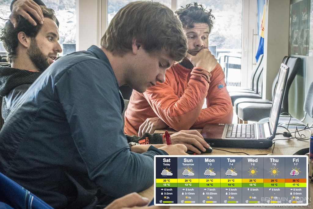 Weather looks bad and flying won't be an option for the race start. Here Manuel Nübel (GER2) and Krischa Berlinger (SUI2) put their heads together to figure out the fastest walking route south from their Salzburg start on Sunday.