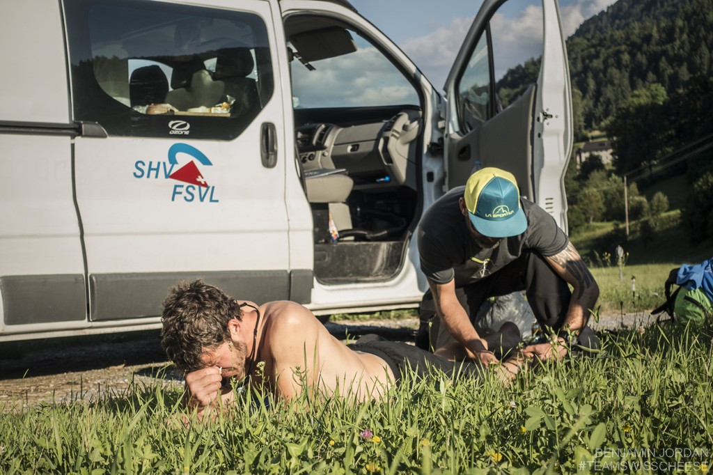 Even though he'd just flown over 100 km, to be competitive in the X-Alps, you have to walk in the evenings as well. Here Nils works to strengthen Krischa's weaknesses.