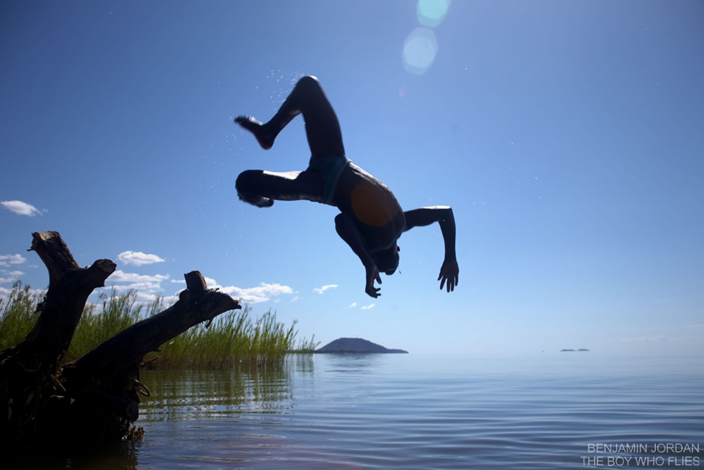 A young boy shows off his shallow dive into the refreshing, clear water of Lake Malawi.